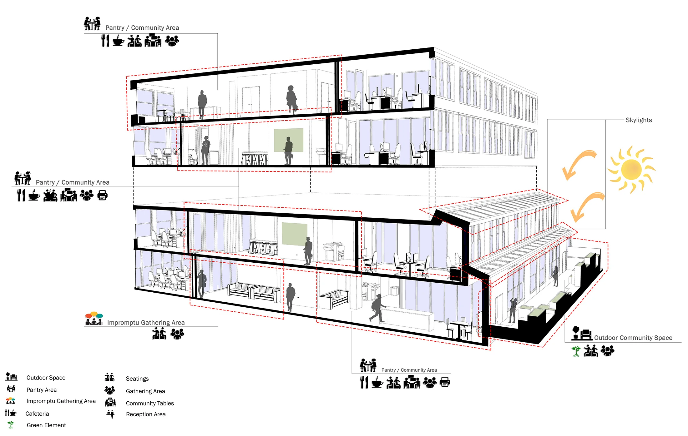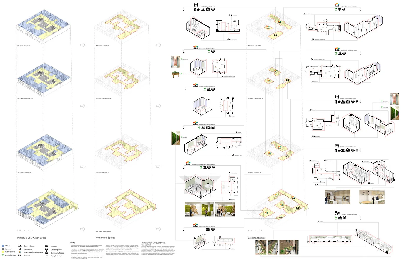 The space, designed to maximize natural light and impromptu gathering spaces, pairs the amenities of the 5th and 6th floors and the 2nd and 3rd floors together with larger planned gathering areas acting as termination points on the 2nd and 6th floors. Continuing to promote wellness in the workplace skylight were reintroduced on the lower levels, a roof terrace reclaimed on the 2nd floor (once nightclub) for member access, and auxiliary use space introduced in the cellar along with showers and a more significant member pantry area for colder months when the terrace is unused.